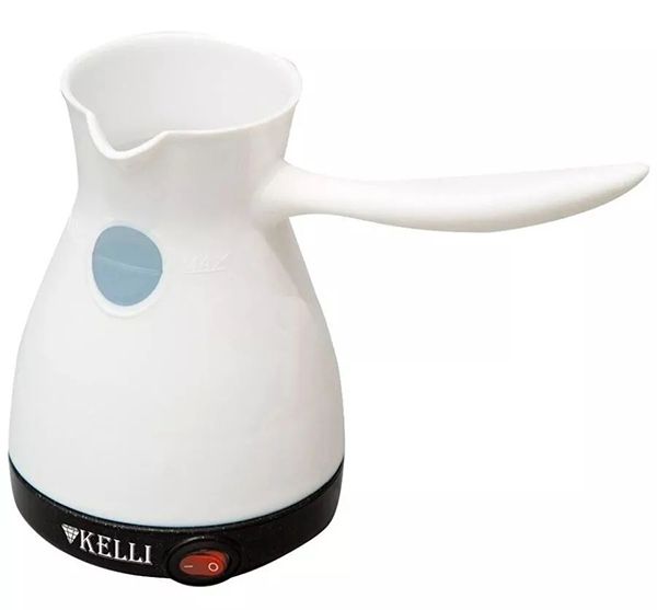 Турка электрическая Kelli KL-1445: Объем турки на 4 чашки (600 мл), закрытый нагревательный элемент, световой индикатор включения, защита от включения без воды и от перегрева, мощность 800 Вт, пластиковый корпус.
